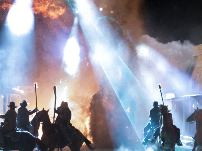 E é aí que o estranho forasteiro, antes desprezado, passa a ser a única opção de salvação para a cidade. O cowboy Jake se une a Dolarhyde e seus homens, e ainda a moradores, foras-da-lei e guerreiros Apache, além da viajante Ella (Olívia Wilde), na luta contra uma espécie de terror sobrenatural. O pistoleiro aos poucos rememora quem é e onde esteve, e percebe que detém um segredo que pode dar à cidade uma chance contra a força alienígena. Produzido por Steven Spielberg.