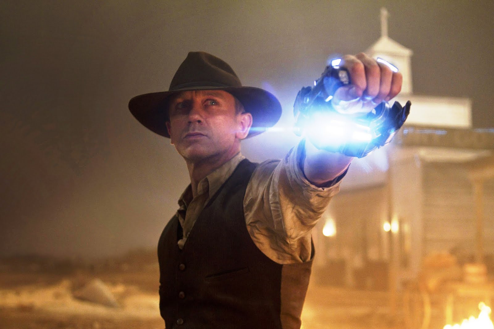 Em Cowboys e Aliens, Daniel Craig é Jake Lonergan, um forasteiro sem memória que chegou ao deserto de Absolution, no Arizona, tendo como referência do passado apenas uma estranha algema em seu pulso. Rejeitado pelos moradores, ele descobre que nada acontece em Absolution sem que o Coronel Dolarhyde (Harrison Ford) ordene. Mas naves voadoras e lumionosas passam a atacar a cidade e abduzir pessoas indefesas, além de causarem destruição por onde sobrevoam.